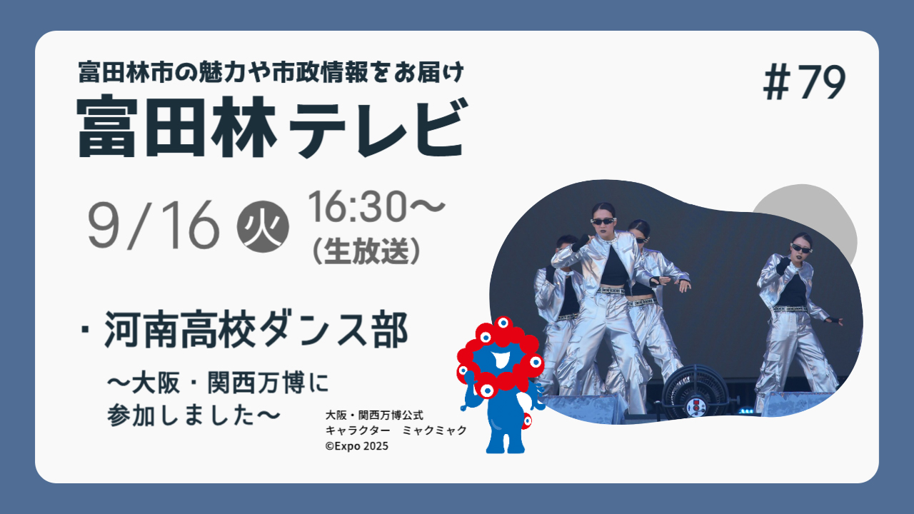 太子TV(太子町)配信動画 太子TV(太子町) 太子TV #50 2025年8月28日(木) 16:00~生配信! MC: 四天王寺大学 学生広報スタッフ 森岡 来未 四天王寺大学 学生広報スタッフ 古家 絢乃 コーナー① 閉幕まで1カ月半!万博へ… 市町村ライブ配信配信動画 2025/08/27