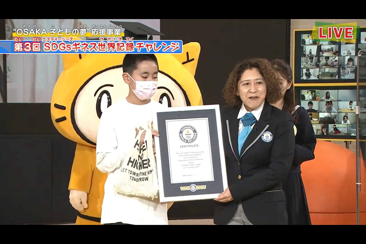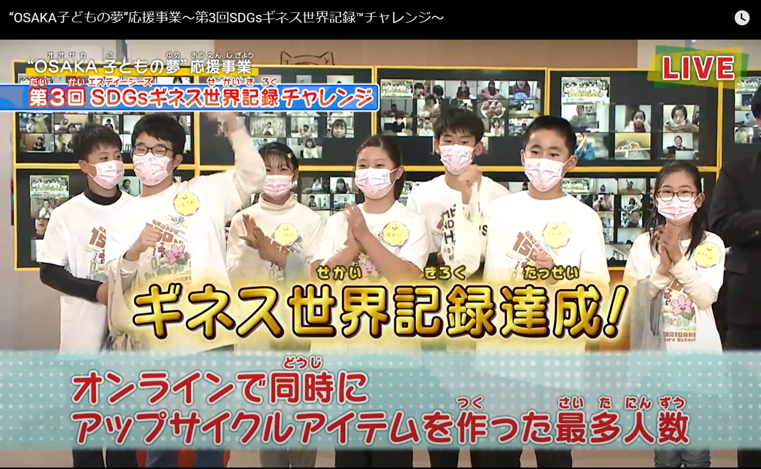 大阪府が参画している公民連携の取組みの一つ、OSAKA KOUMIN Action Platformは、“OSAKA子どもの夢”応援事業~第3回SDGsギネス世界記録チャレンジ~(以下、本事業)を2023年1月15日(日曜日)に開催した。 ギネス世界記録へ挑戦し記録達成することで子どもたちの記録・記憶に残るかけがえのない成功体験を通じ、子どもたちの健やかな育ちと前向きに生きる力の醸成を目的としている。 第3回目の今回は「オンラインで同時にアップサイクルアイテムを作った最多人数」でギネス世界記録に挑戦し、見事ギネス世界記録に認定されました。