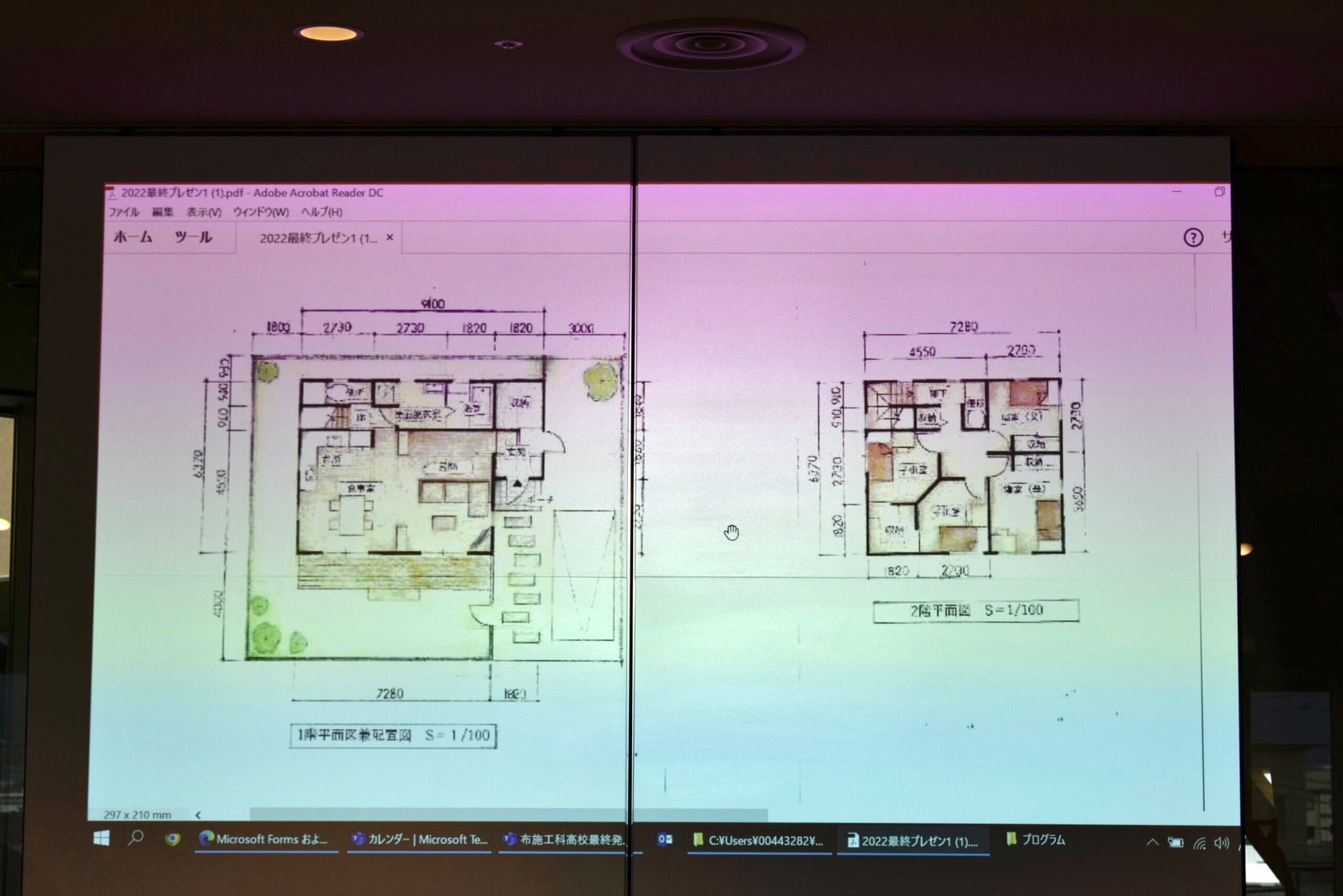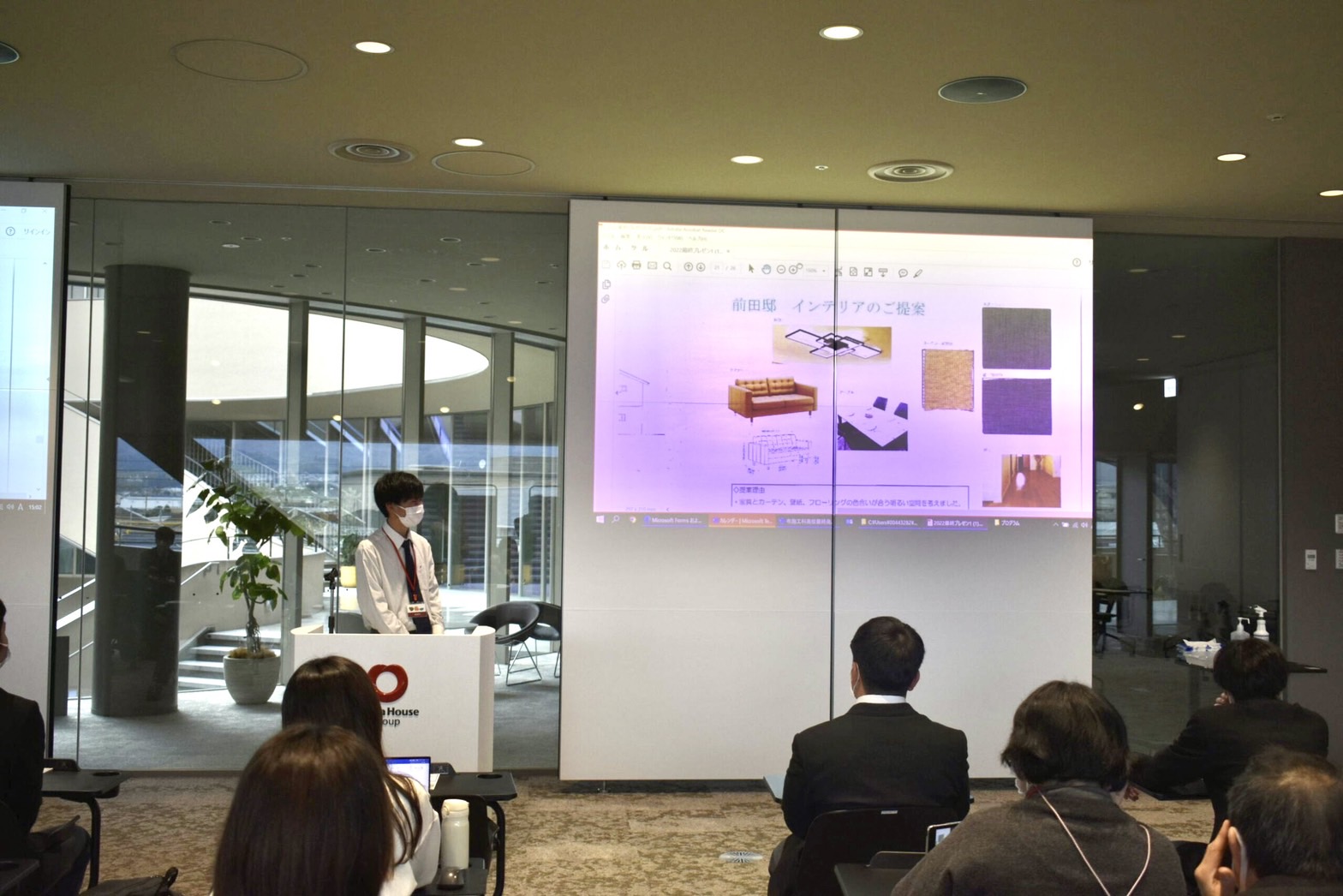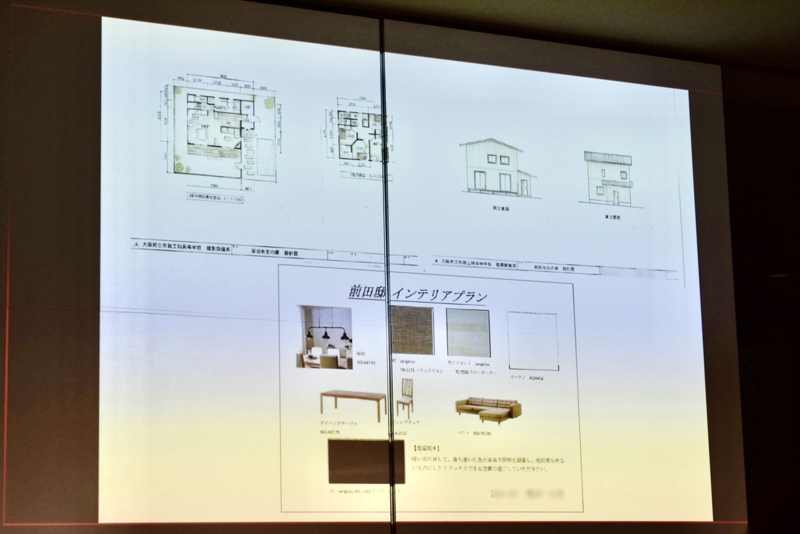 最終課題は布施工科高校の教員をお客様と見立て、理想の暮らし方を叶えられる家づくりに挑戦し、インテリアを含めた自由設計に取り組んだ。発表会では、自身が作成したプランをコンセプトから説明し、工夫した点や研究を行う過程での気づき等を交えながら、大和ハウス工業社員や布施工科高校の教員に対しプレゼンを行った。