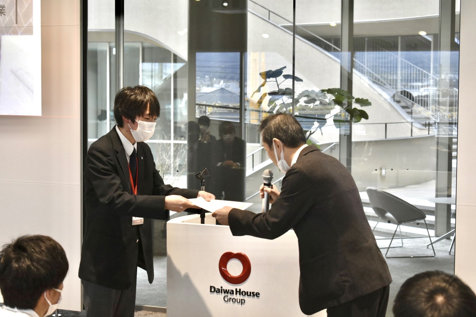 1年間の課題研究を終えた生徒に対し、大和ハウス工業の社員から修了証書と記念品が贈られた。