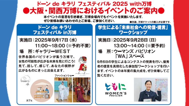 9月の「OSAKA女性活躍推進月間」に合わせ、9月5日(金)・6日(土)・17日(水)・28日(日)に女性活躍推進イベント「ドーン de キラリ フェスティバル 2025」及び「ドーン de キラリ フェスティバル 2025 with万博」をドーンセンター(大阪市中央区)及び大阪・関西万博会場内で開催します。
