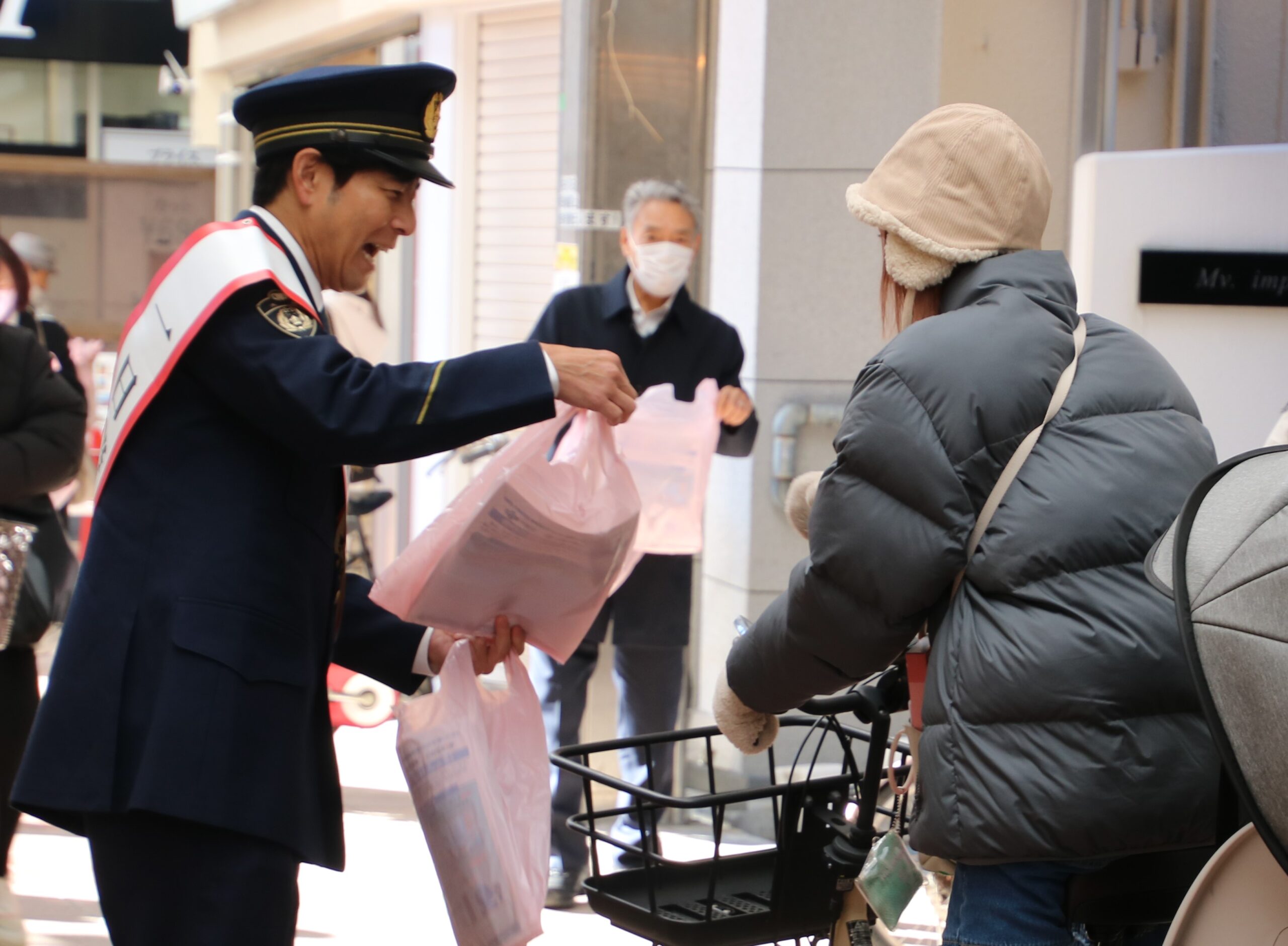 また、イベントの最後には、柏里本通商店街を玉置 恭一 氏をはじめダスキン担当者と西淀川警察署員が巡回し、近隣住民へ啓発チラシを配布。防犯対策の重要性を訴えた。