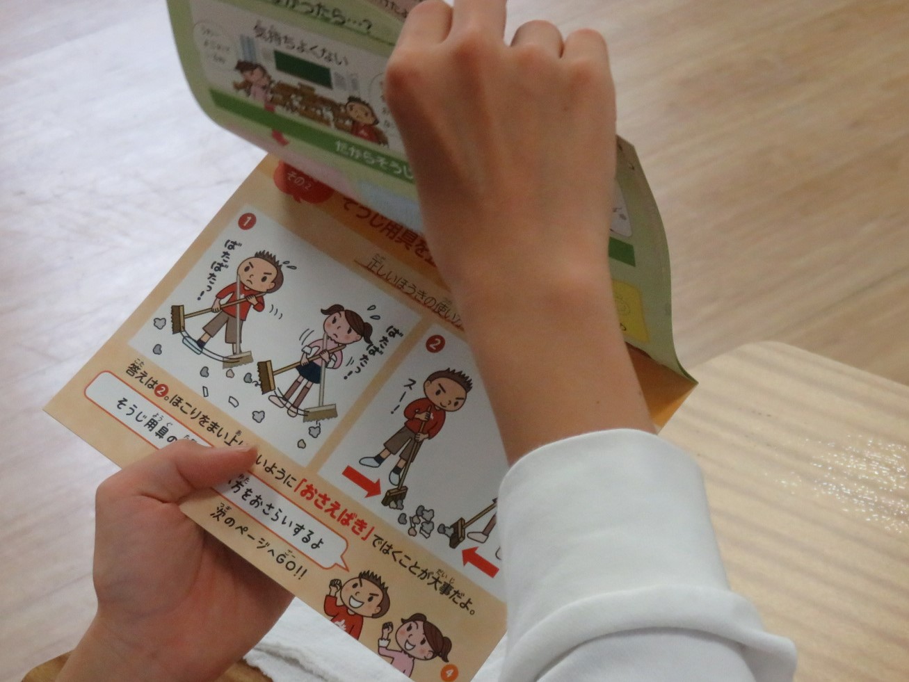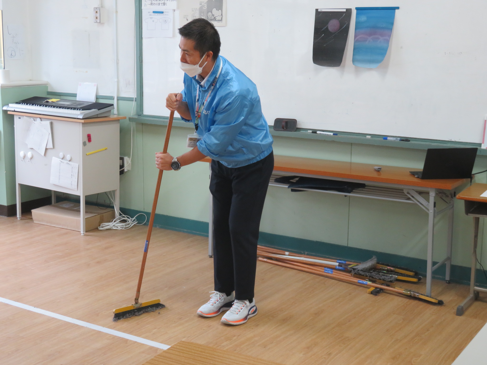 当日は中学部2年生の生徒29人が参加し、ダスキンお掃除教育研究所の担当者が講師となり「おそうじの出前授業」を実施した。おそうじ手帳を活用し生徒たちがほうきの使い方やぞうきんの絞り方など、掃除の基本を体験しながら学んだ。