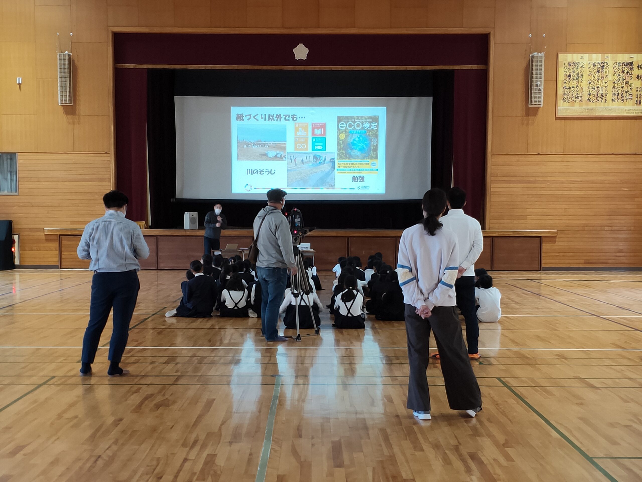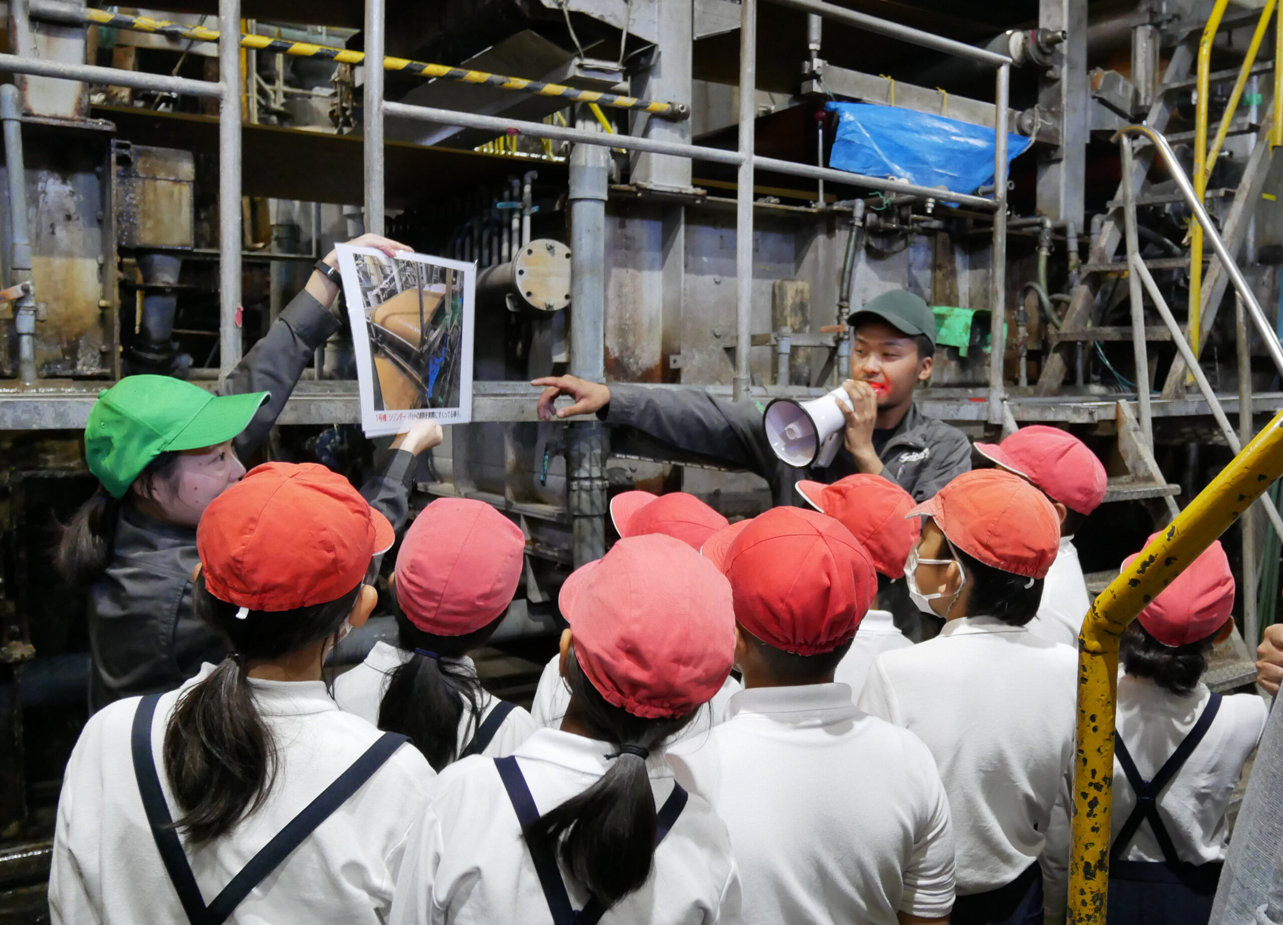 昭和32年会社設立以来50周年を迎えるまで、ほとんど地元とのご縁がありませんでしたが、50周年を機に経営理念を刷新して以来、環境に配慮した循環型社会に貢献する製紙会社をめざしてきました。その一つに、弊社の横を流れる2級河川(男里川)の清掃活動があります。社員と共に男里川の清掃を継続することで地元の人達との交流も生まれ、縁あって6年前からNPO法人JAE様のお力添えを戴いて、地元の小学校への出前授業を行っています。大人(社員)から働く事の喜びや意義を聴くことで子供達も将来への夢を描き、社員たちも子供たちに自分の想いと伝える事で成長に繋がり、仕事への誇りも感じる機会となっています。
