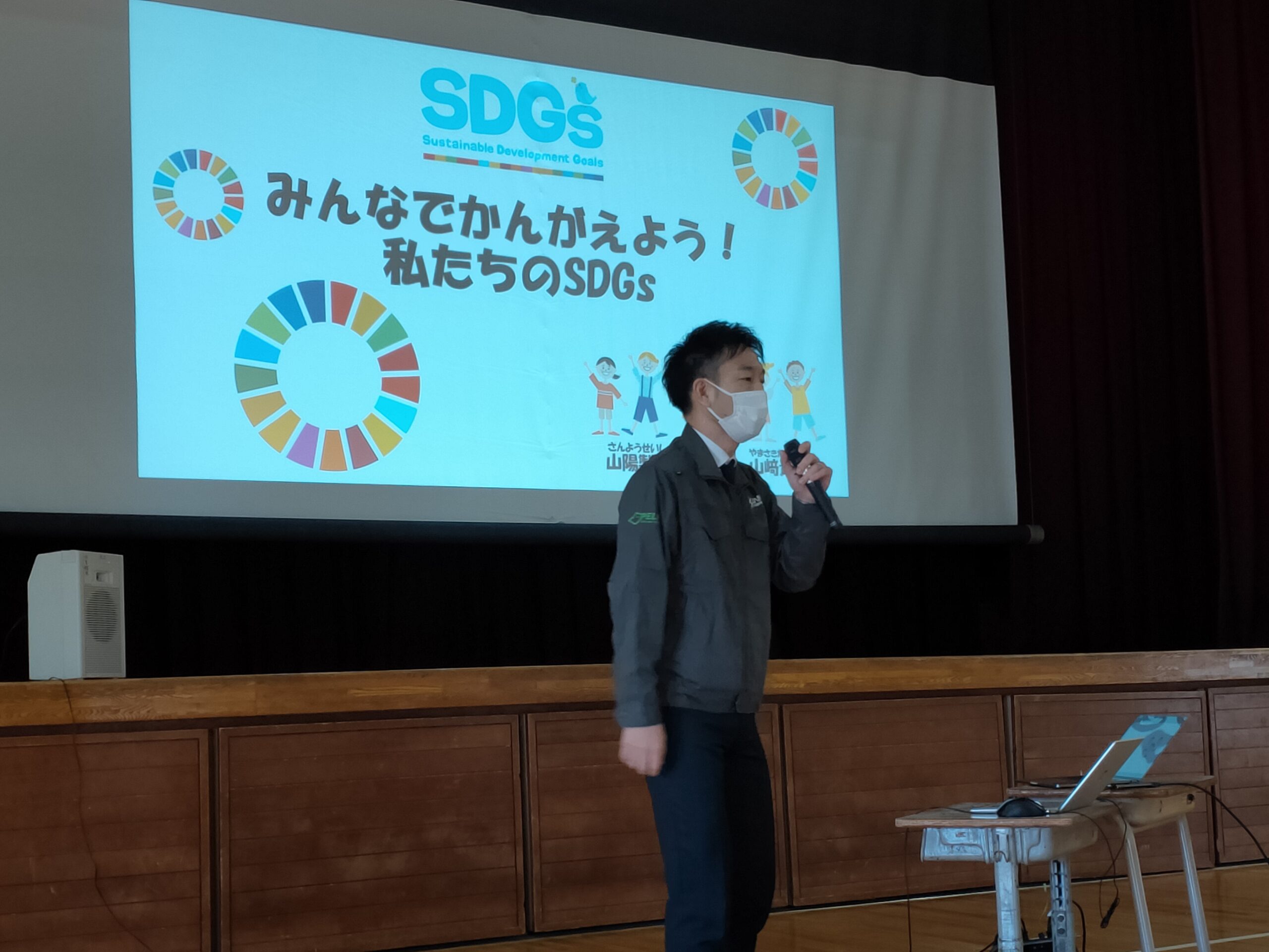 岸和田市立八木北小学校での出前授業を終えた、山陽製紙株式会社 山崎 貴史 氏は、「まず、生徒にSDGsという言葉を知っているかと質問した際、挙手率の高さに感動しました。今回は私たちの事業である紙創りも交えながら、個人や企業で取