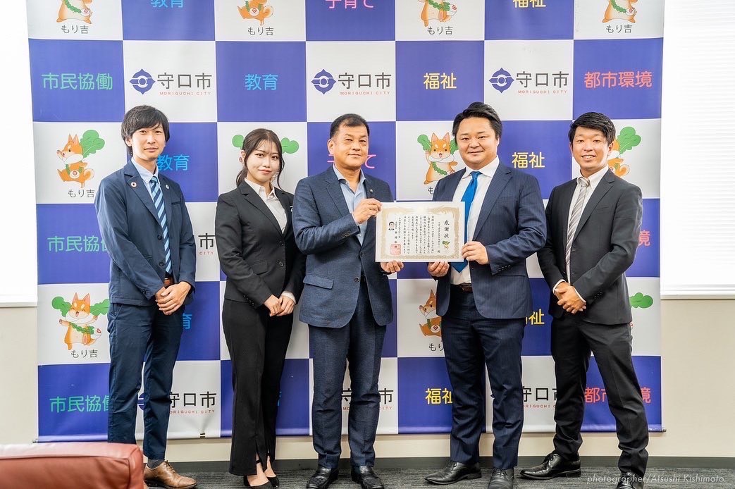 令和4年8月31日(水)に、守口市役所で行われた感謝状贈呈式には、リディアダンスアカデミー 三木 侑平 代表、守口市 西端 勝樹 市長らが出席し、守口市から感謝状が贈呈された。