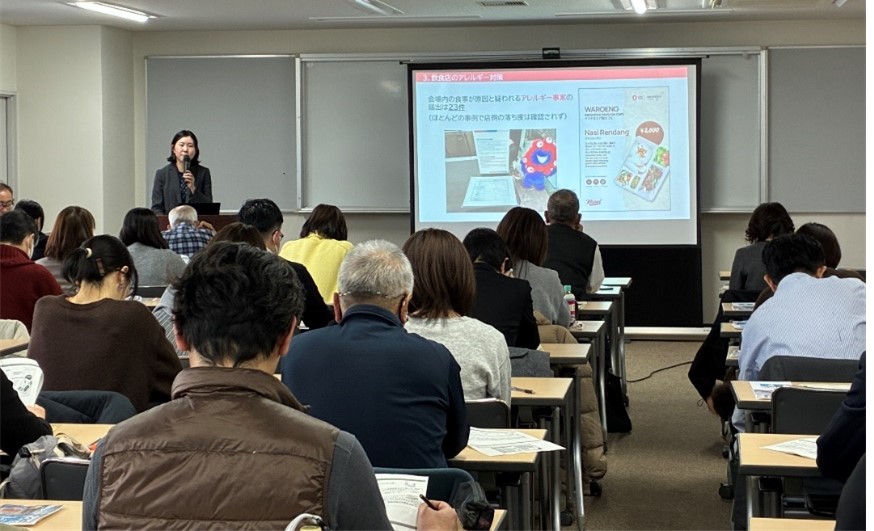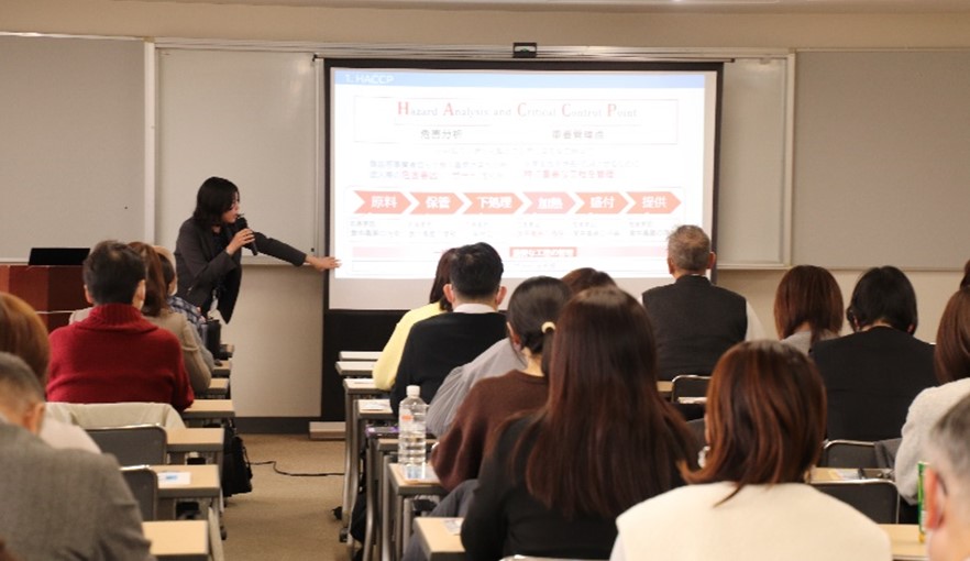 第一部では、「大阪・関西万博の事例を交えた食品衛生対策について」と題し、大阪・関西万博会場内において食品衛生関係業務に携わった経験を持つ大阪府健康医療部食の安全推進課の担当者が登壇。HACCPの考え方を取り入れた衛生管理や食中毒予防対策、飲食店におけるアレルギー情報の提供など、食材や文化の違いを実感した万博での具体的な経験を交えながら解説。参加者は熱心に耳を傾けていた。