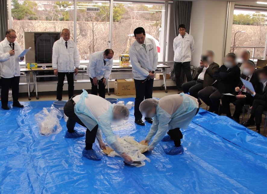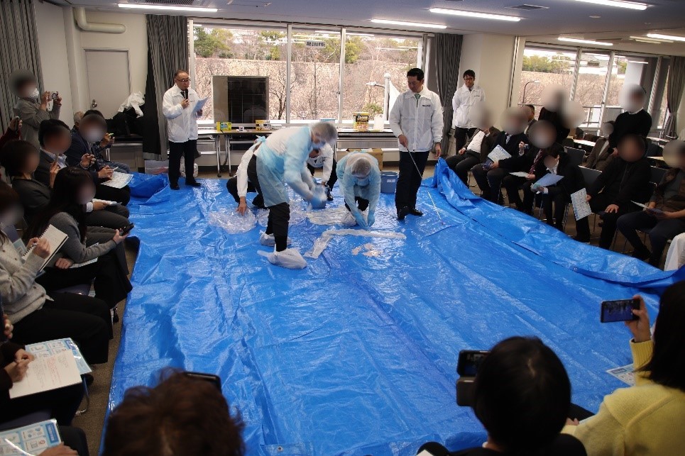 第二部では、ダスキンによる「衛生のプロによる嘔吐物処理の実演」を実施。ノロウイルスなどのウイルス感染を拡大させないための適切な処理方法について学んだ。実演では、参加者の中から1名が実際に処理作業を体験。エプロンや手袋などの防護服を着用したうえで、嘔吐物に見立てたヨーグルトを用い、作業手順を確認しながら丁寧に処理を行った。