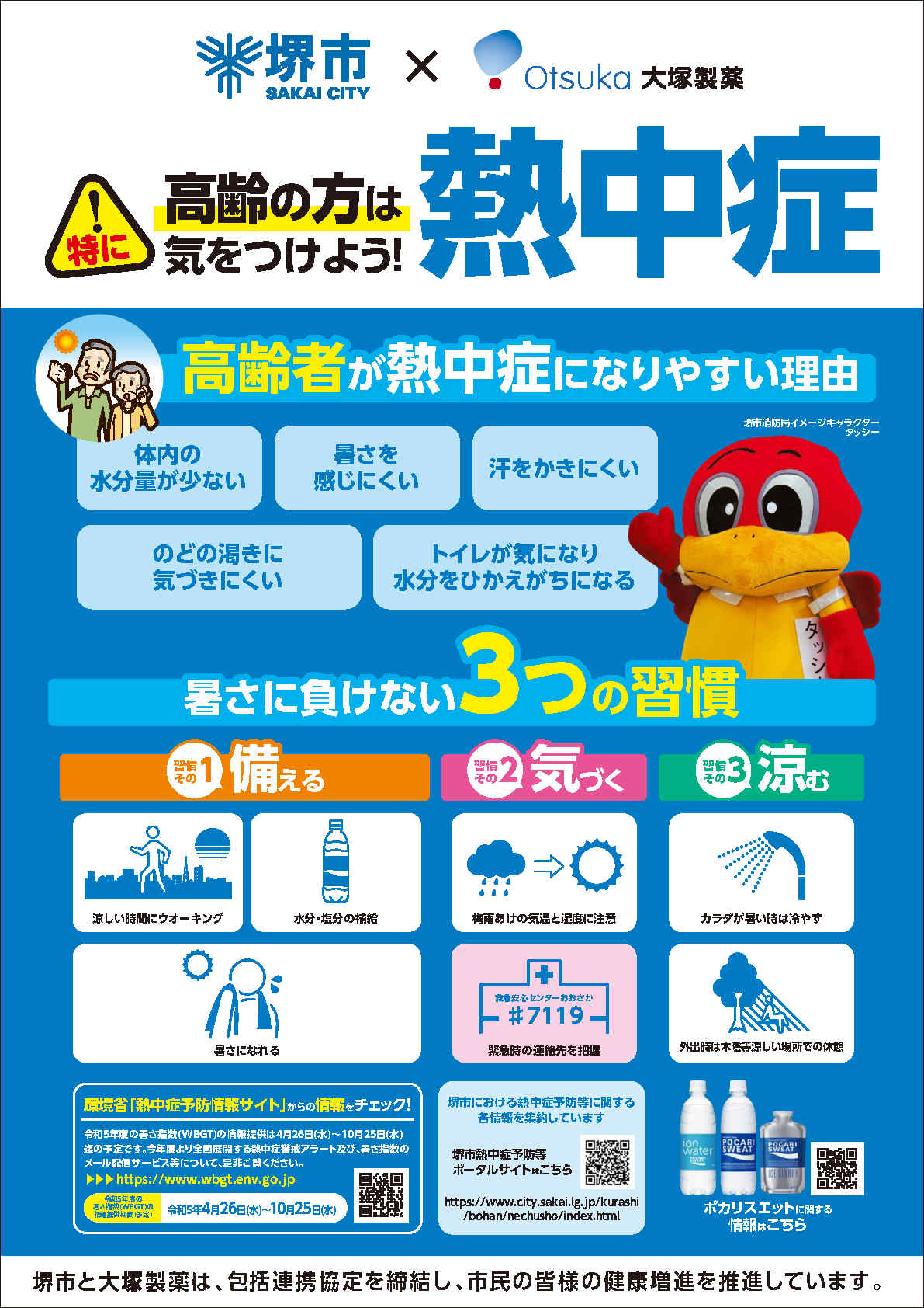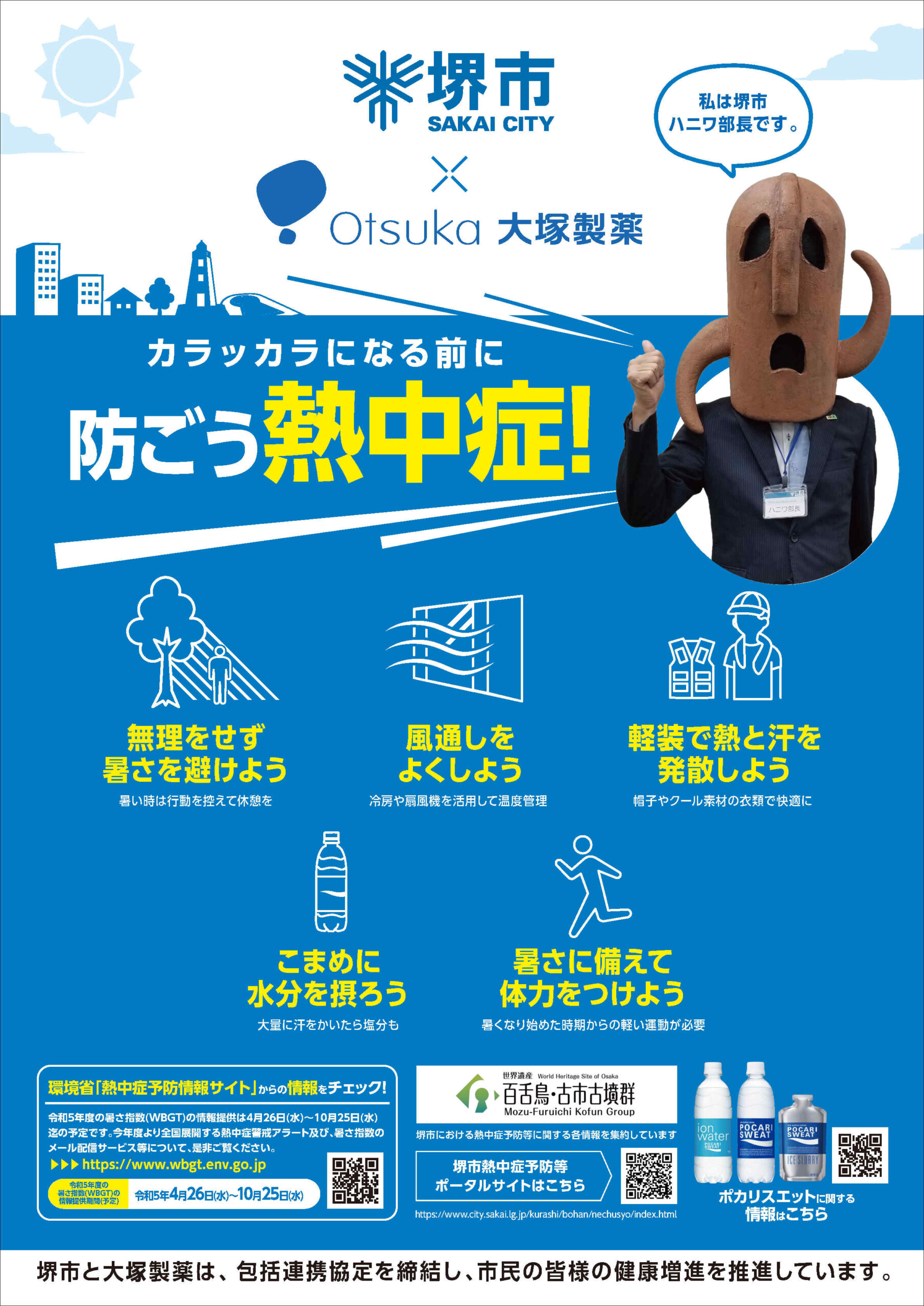 堺市と包括連携協定を締結している大塚製薬株式会社(本社:東京都千代田区、代表取締役社長:井上 眞)は、6月から堺市内にポスターの掲示とチラシを配架し、熱中症予防の普及啓発を行っている。