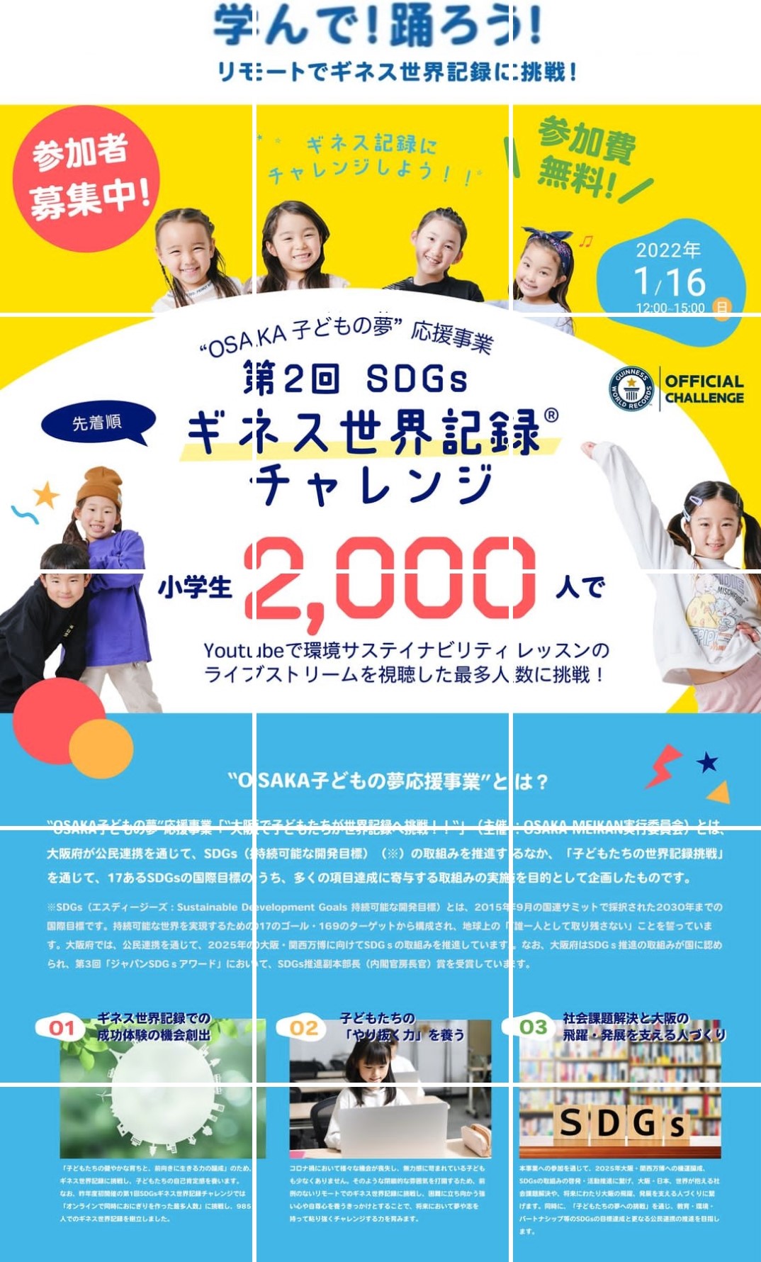 大阪府が参画している公民連携の取組みの一つ、OSAKA MEIKAN実行委員会は、令和4年1月16日(日曜日)に「”OSAKA子どもの夢“応援事業~第2回SDGsギネス世界記